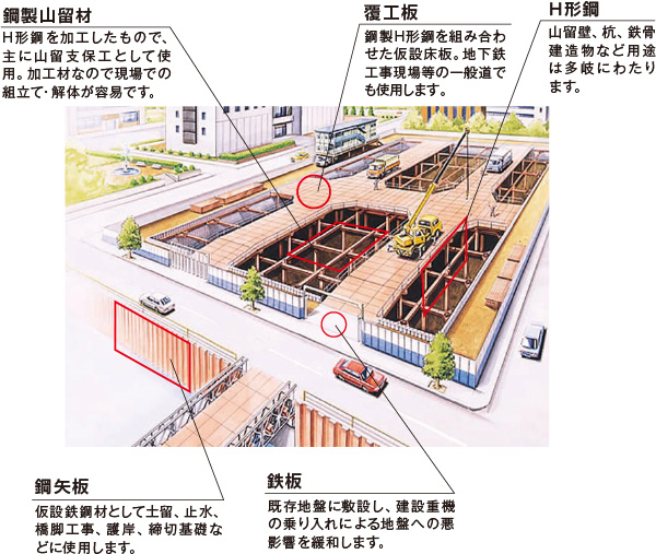 丸建リースの製品は、実に多彩です。高層ビル、新交通システム、地下鉄など都市空間創造の場や、さらに港湾、河川、上下水道など、環境整備のあらゆる場所で目覚ましい活躍を続けています。