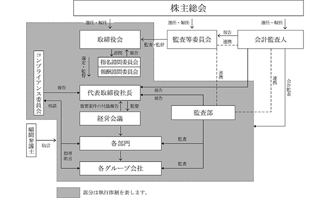当社は、「監査等委員会設置会社」を採用しております。これは、監査等委員である取締役が取締役会における議決権を有することを通じた、経営監督機能の強化によるコーポレート・ガバナンスの更なる充実、及び取締役会の業務執行決定権限の相当部分を取締役に委任することが可能になることにより、経営の意思決定の迅速性向上を目的とするものであります。