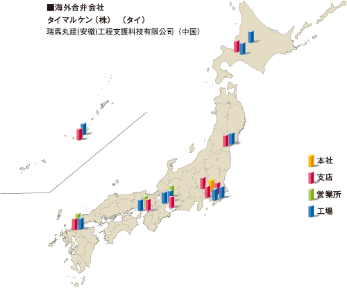 丸建リースは、国内に13の本・支店・営業所及び11工場という信頼のネットワークをめぐらせ、全国各地に展開しています。当社は、営業・工事・技術・工場の各部門が密接な連携をとり、ユーザーの要望に即応し、安心してご利用いただけるような万全の体制を整えています。