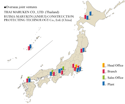 Maruken Lease Co., Ltd. has 13 offices (head offices, branches, and sales offices) and 11 plants located in Japan, as its “Network of Confidence.” We thoroughly prepare ourselves by working in cooperation with the sales, construction, engineering, and plants divisions and by immediately responding to our clients in order to satisfy their needs as well as to obtain their trust.